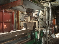 蒸し機に茶葉を投入しています。投入機より連続して茶葉を蒸し機に入れて蒸しています。